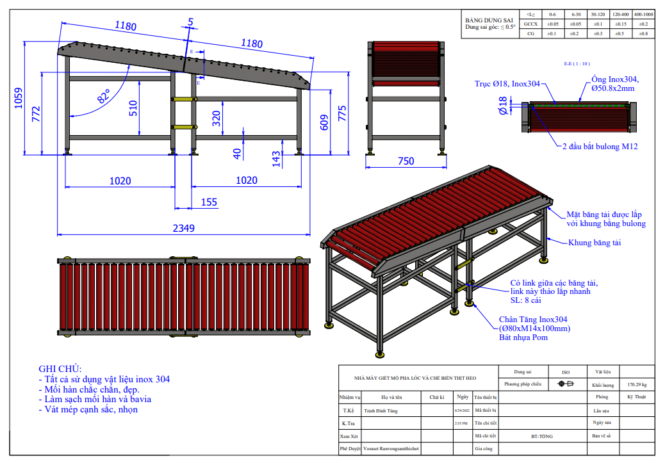 Bách Hóa Inox xin chia sẻ bản vẽ hệ thống băng truyền sử dụng con lăn inox dùng trong nhà máy chế biến thịt gia súc.