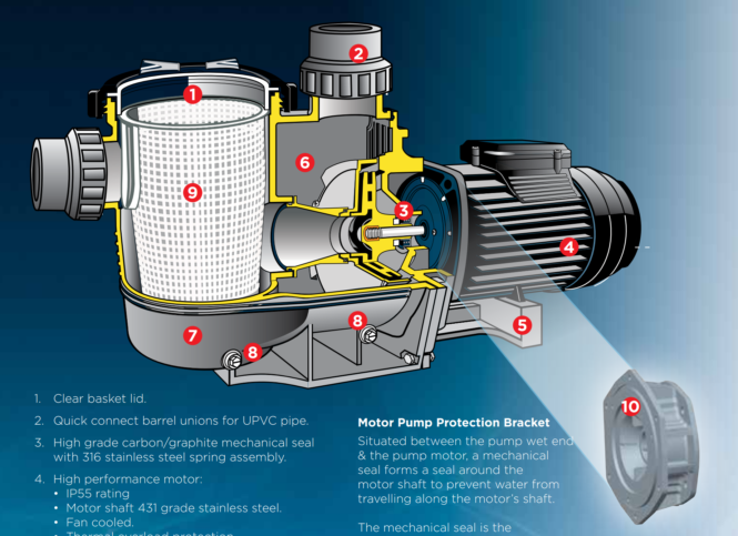 Phớt cơ khí bằng thép không gỉ 316 cao cấp được kết hợp để bảo vệ thêm chống lại sự ăn mòn. ví dụ. từ nước clo, ozon, iot, Baquacil, brom và nước muối.